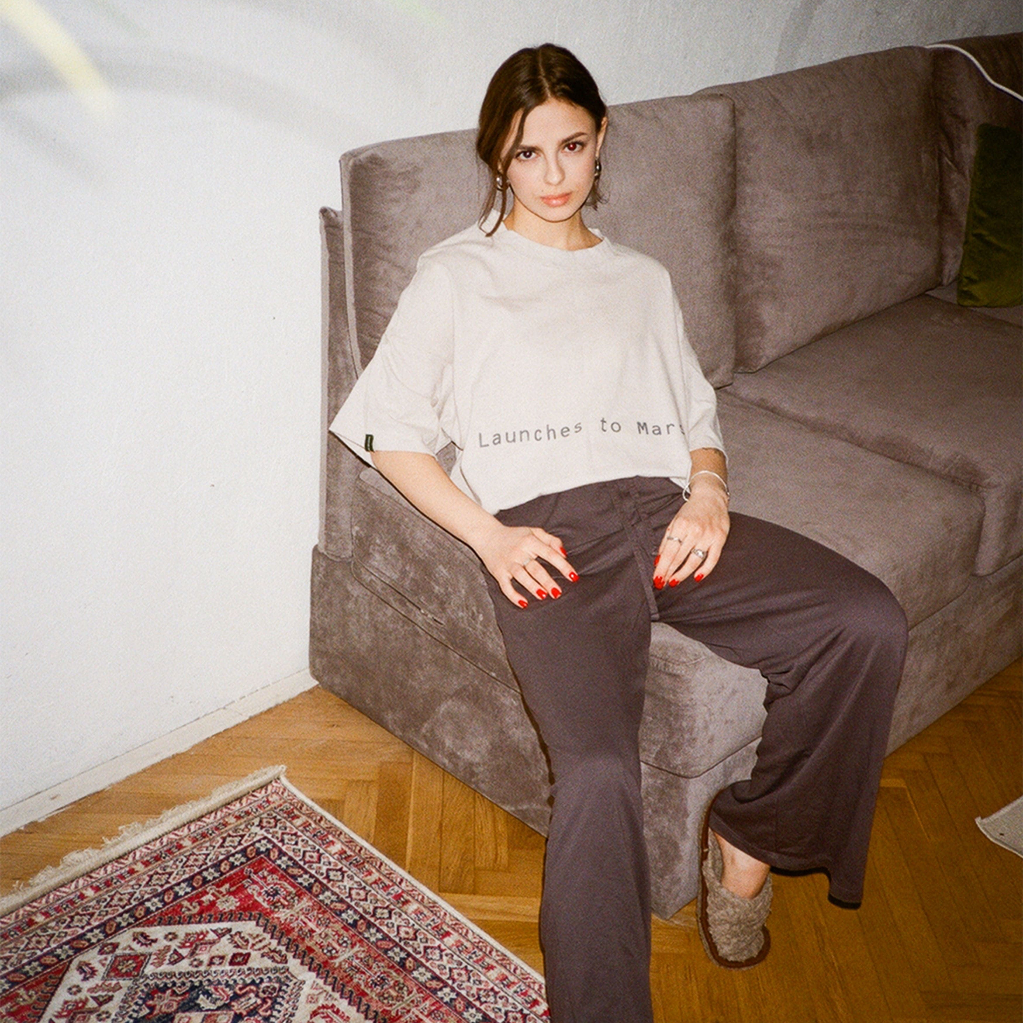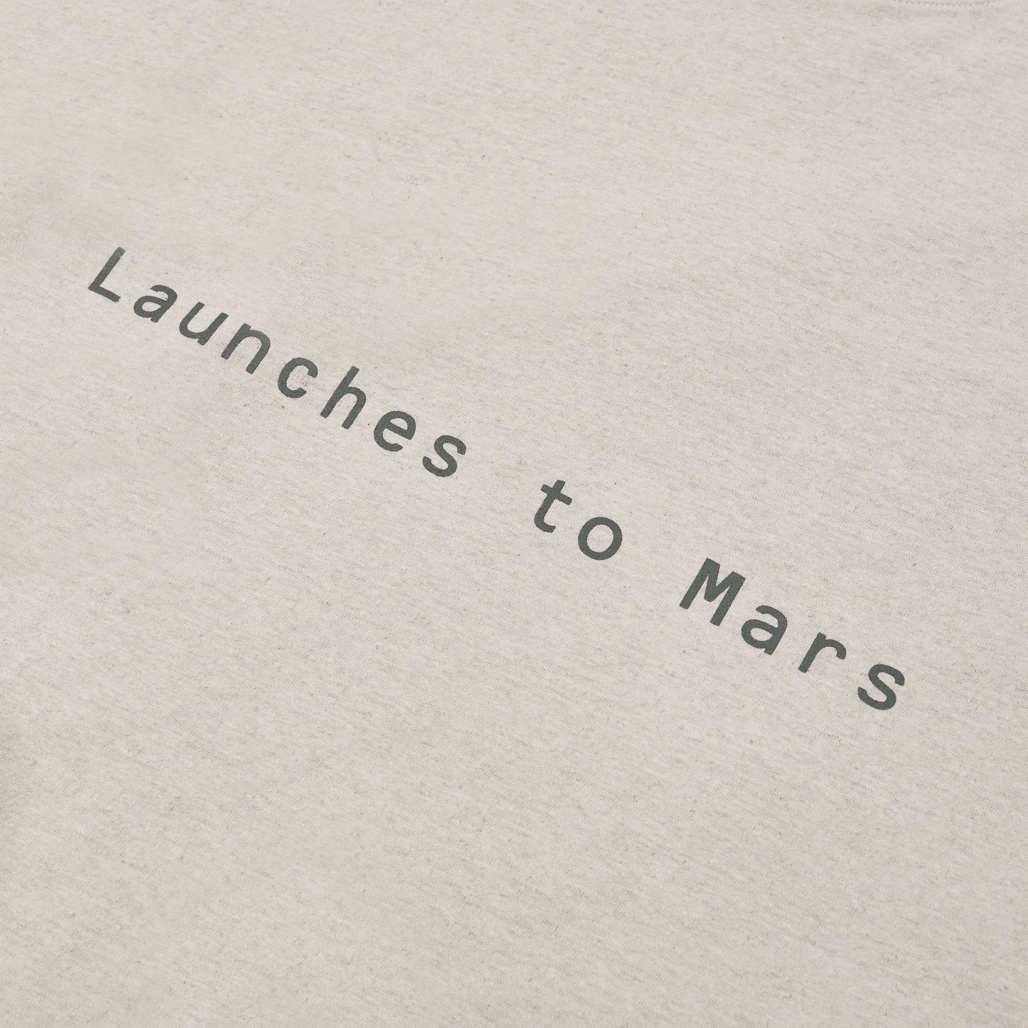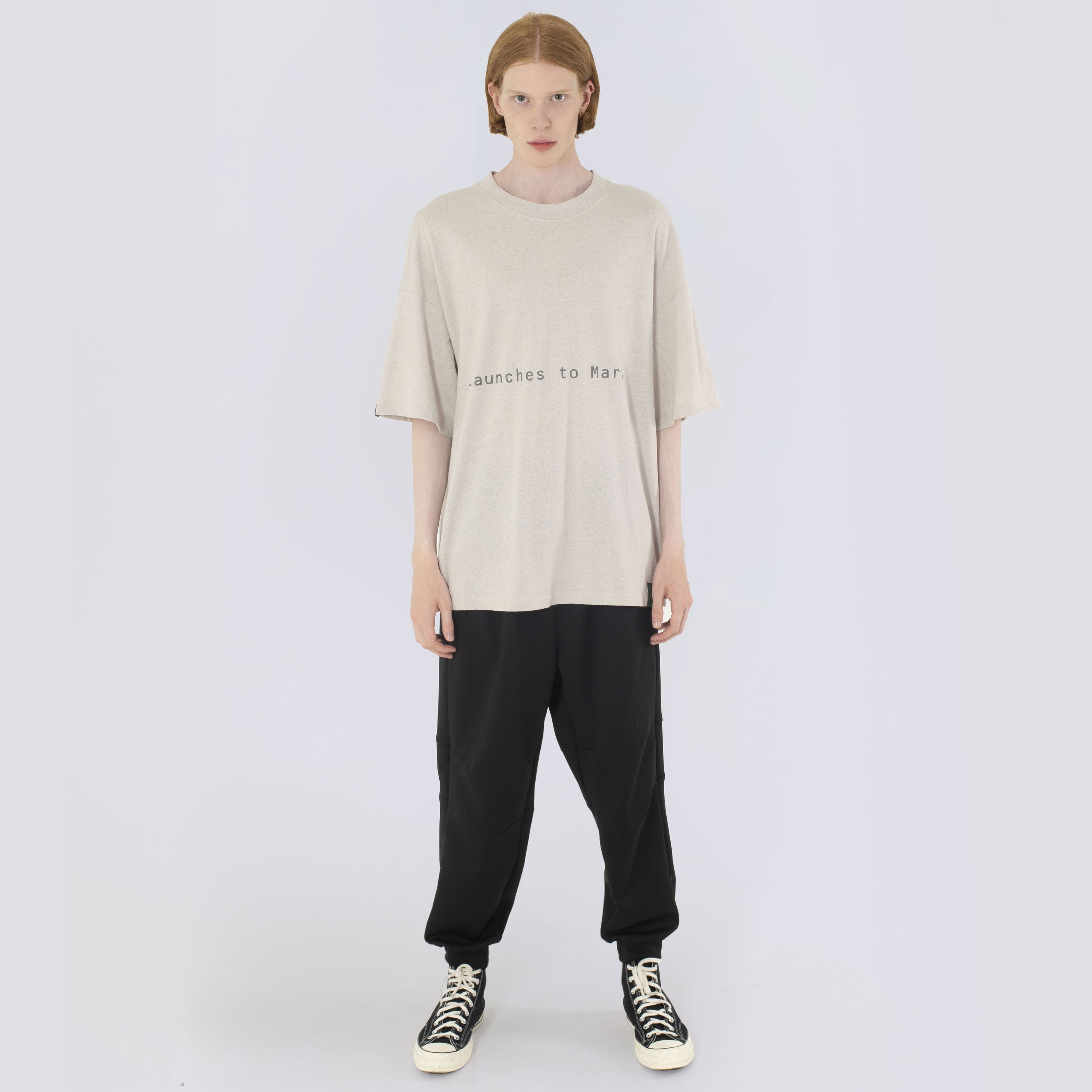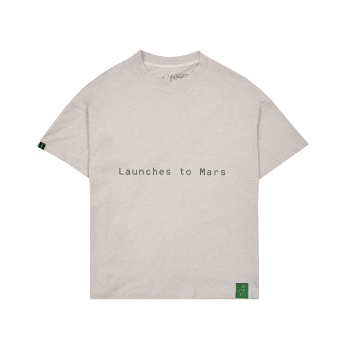 Oversize T-shirt made of unique hemp fabric. Mars-themed prints on chest and back. Stitched NFC tag under logo.