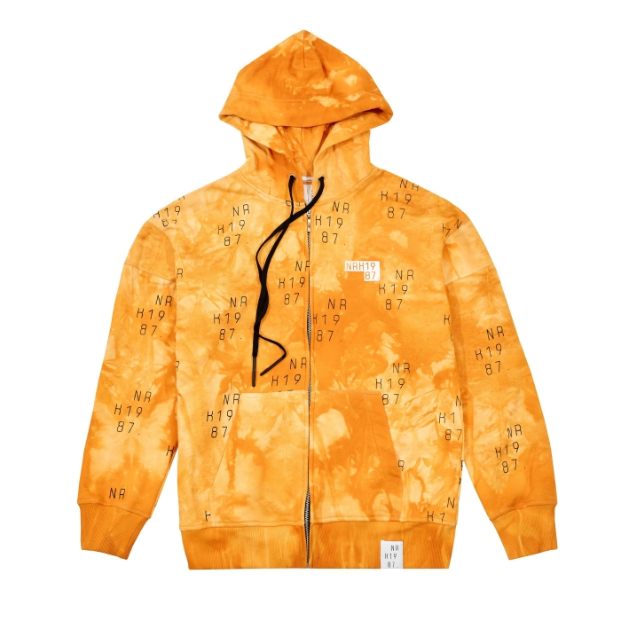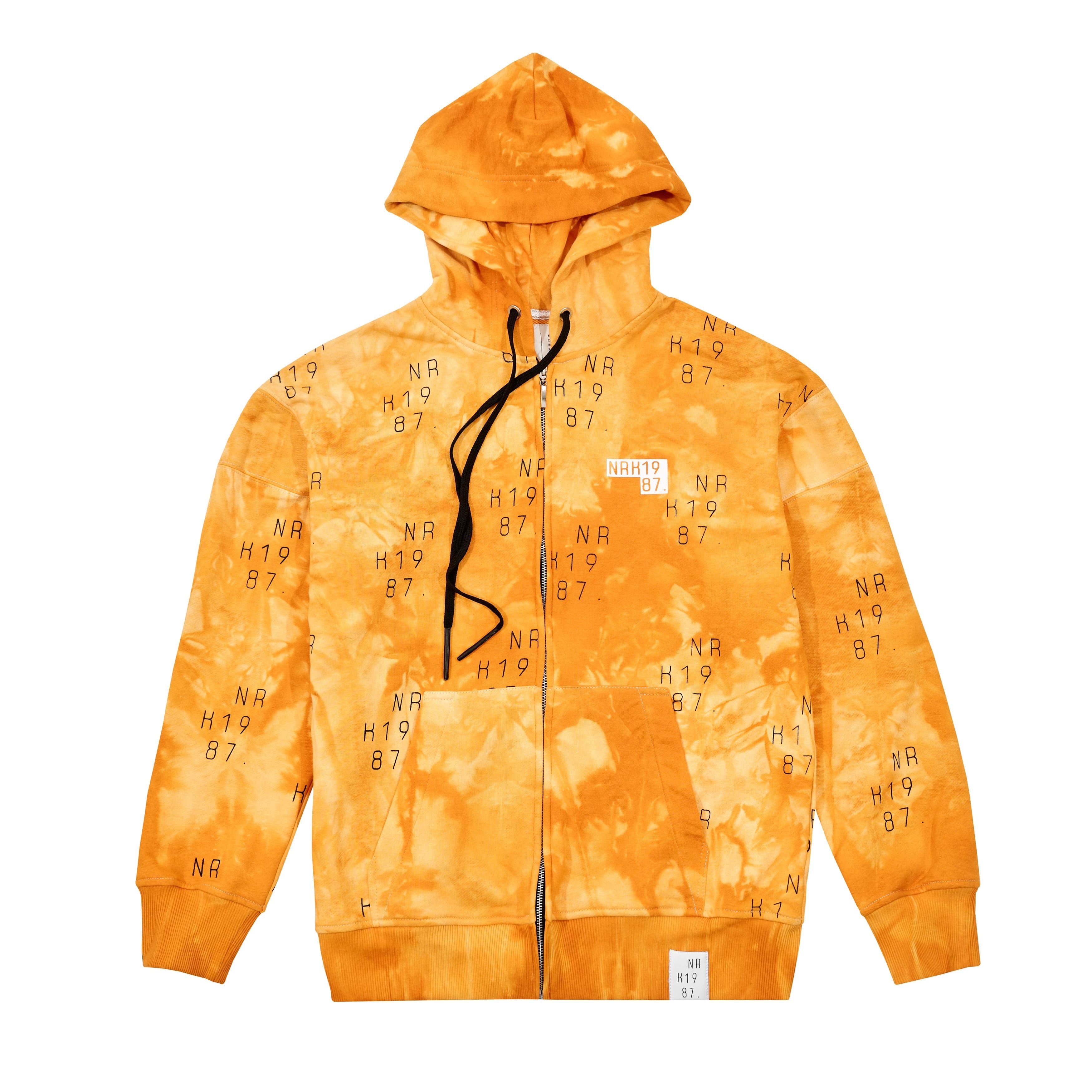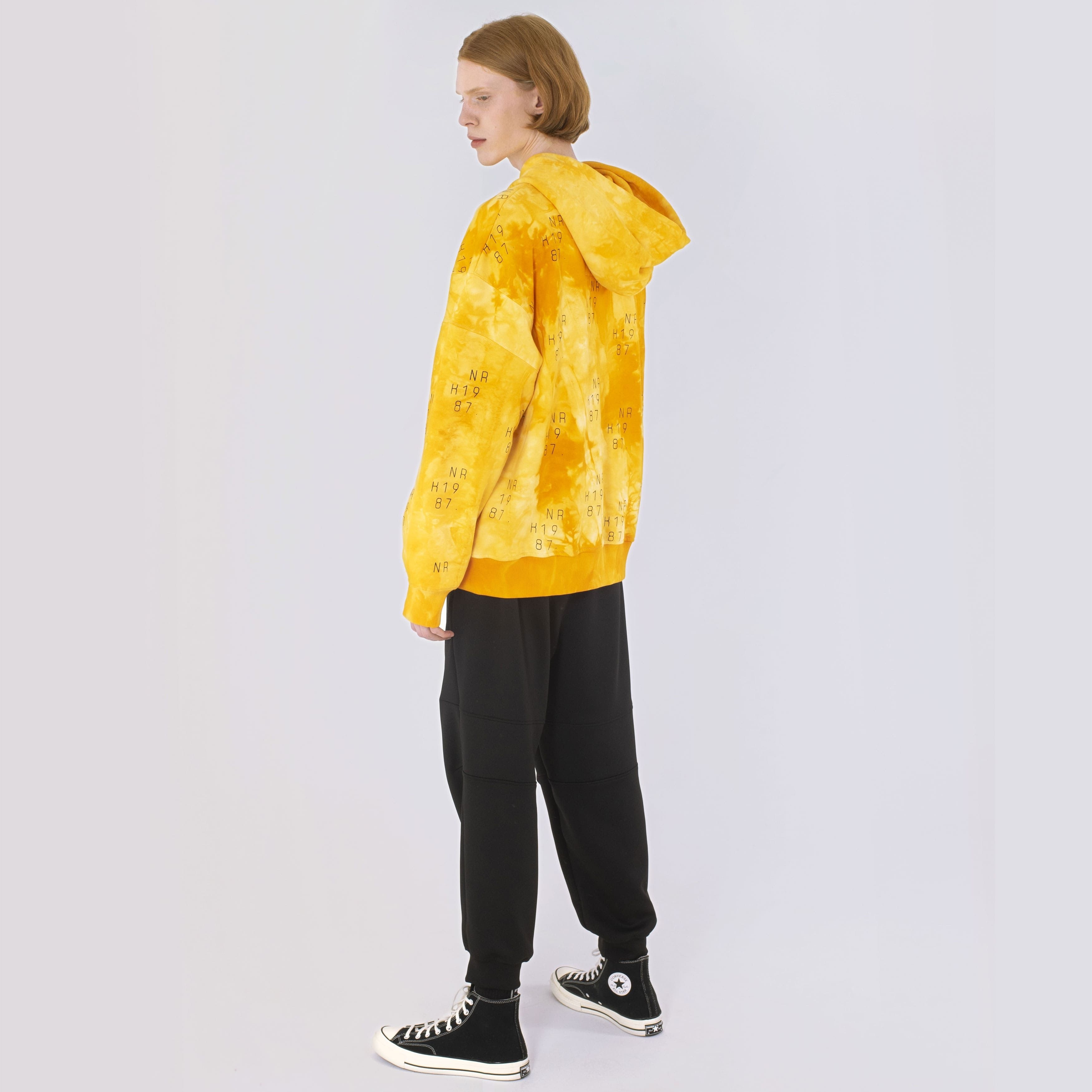 Zippered sweatshirt in lightweight fleece fabric dyed in tai-dai yellow - the color of Jupiter. Loose wide silhouette with dropped shoulder seam. Wearable print with added rubber. Inverted fabric inserts on shoulders. Sturdy metal branded hardware. Voluminous double-lined hood. Extended contrasting drawstrings. Hidden pocket with GPS device and stitched NFC tag under logo.