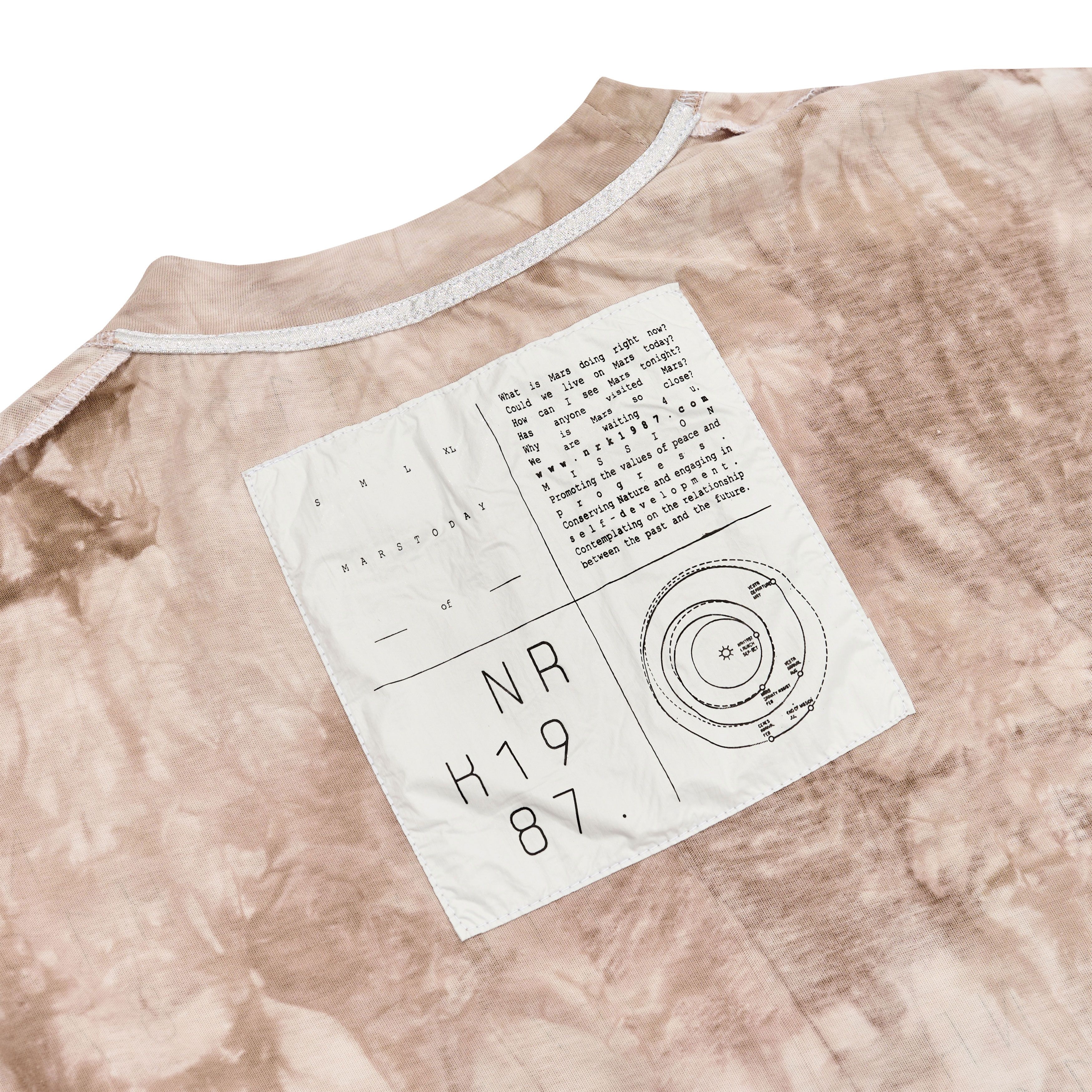 The tie-dye colors of the line symbolize the diversity of space, stars and planets. The logo print is a binary code mosaic symbolizing the scattering of signals into space from Earth. The infographic on the inside back is Mars inputs, the neck label is our goals, philosophy and mission. Brushed nickel fittings are an illustration of the age of the galaxy. Unprinted shoulder inserts - a demonstration of eco-focus and respect for resources.