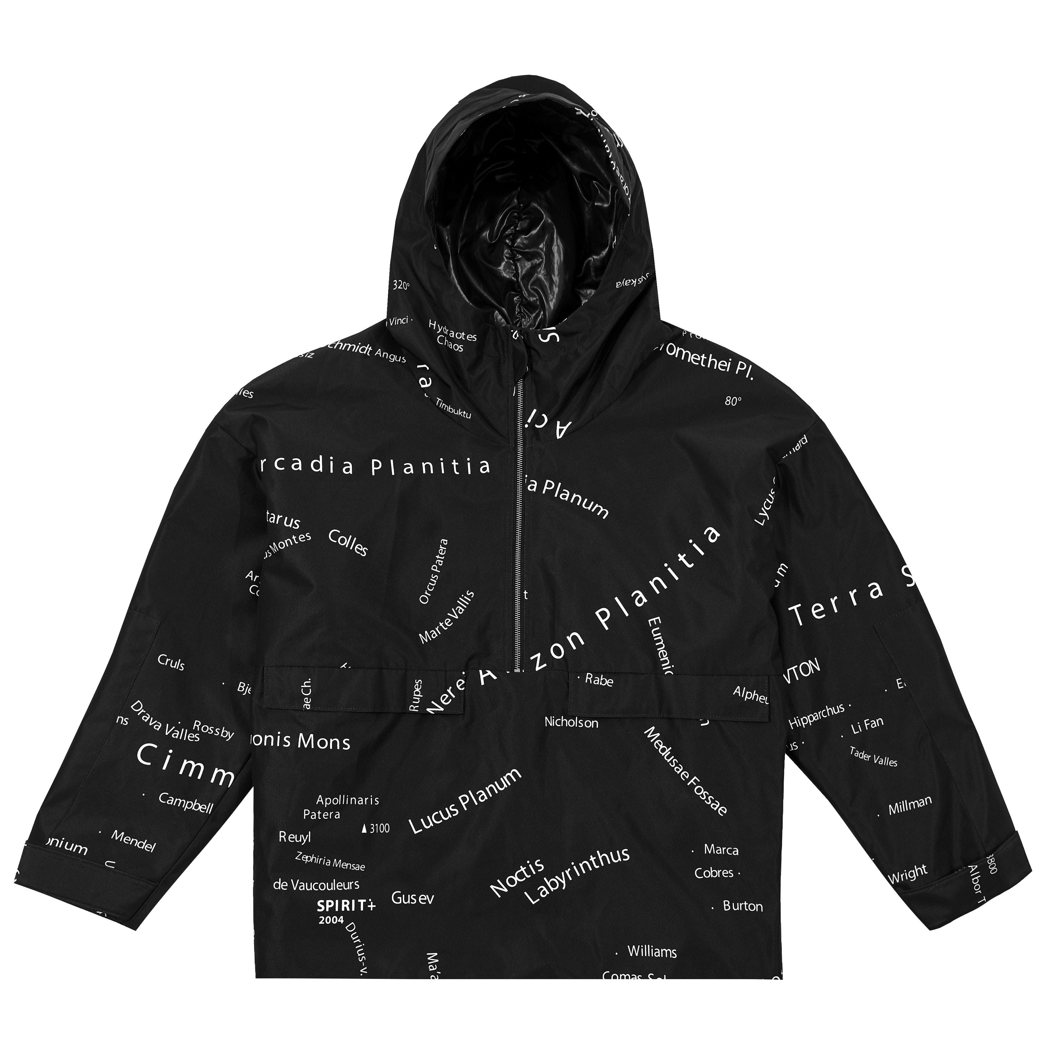 The anorak is presented as a star explorer's outerwear that can be quickly put on and taken off. The space pearl color variant is inspired by the styling of snow-white space suits reflecting the sun's rays. The version with the geography of the planet Mars is based on a real map of Mars, which can be used to orient yourself on the ground.