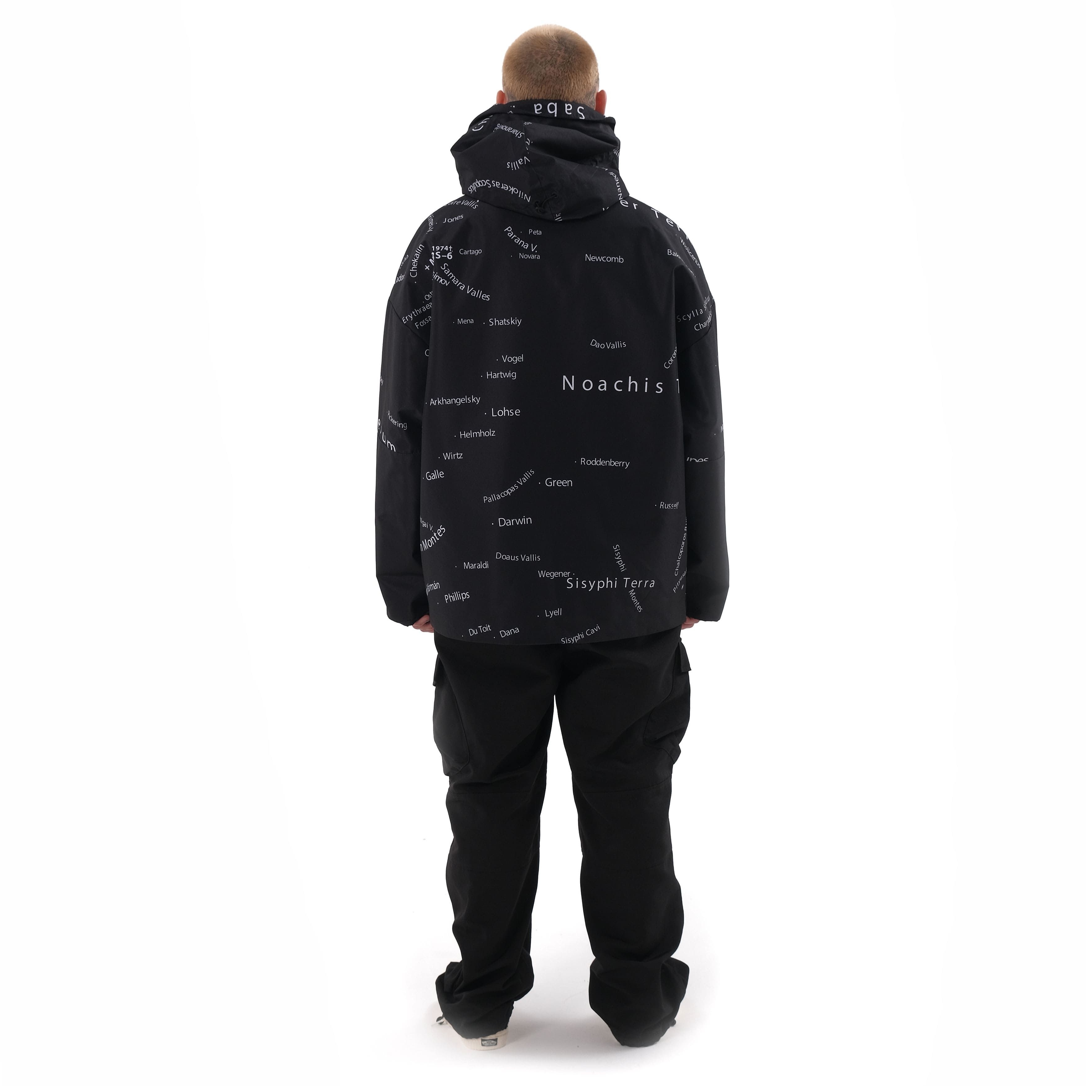 Anorak in two colorways: ultra-lightweight pearl colorblock membrane fabric and ultra-lightweight membrane fabric with a geography print of the planet Mars. Three-layer membrane fabric with 3D rip-stop mesh pattern. Freezeproof to -30°C - designed to withstand brief immersion in water. Ultra-thin heat insulation. Protects from rain and wind. Loose wide silhouette with elongated base. Shark neckline on the hood collar. Sturdy branded hardware, metal zipper. Matte monochrome windproof lining. Pockets and cuffs with concealed magnets. Slits on sides for easy donning. Hidden pocket with GPS device and stitched NFC tag under logo.