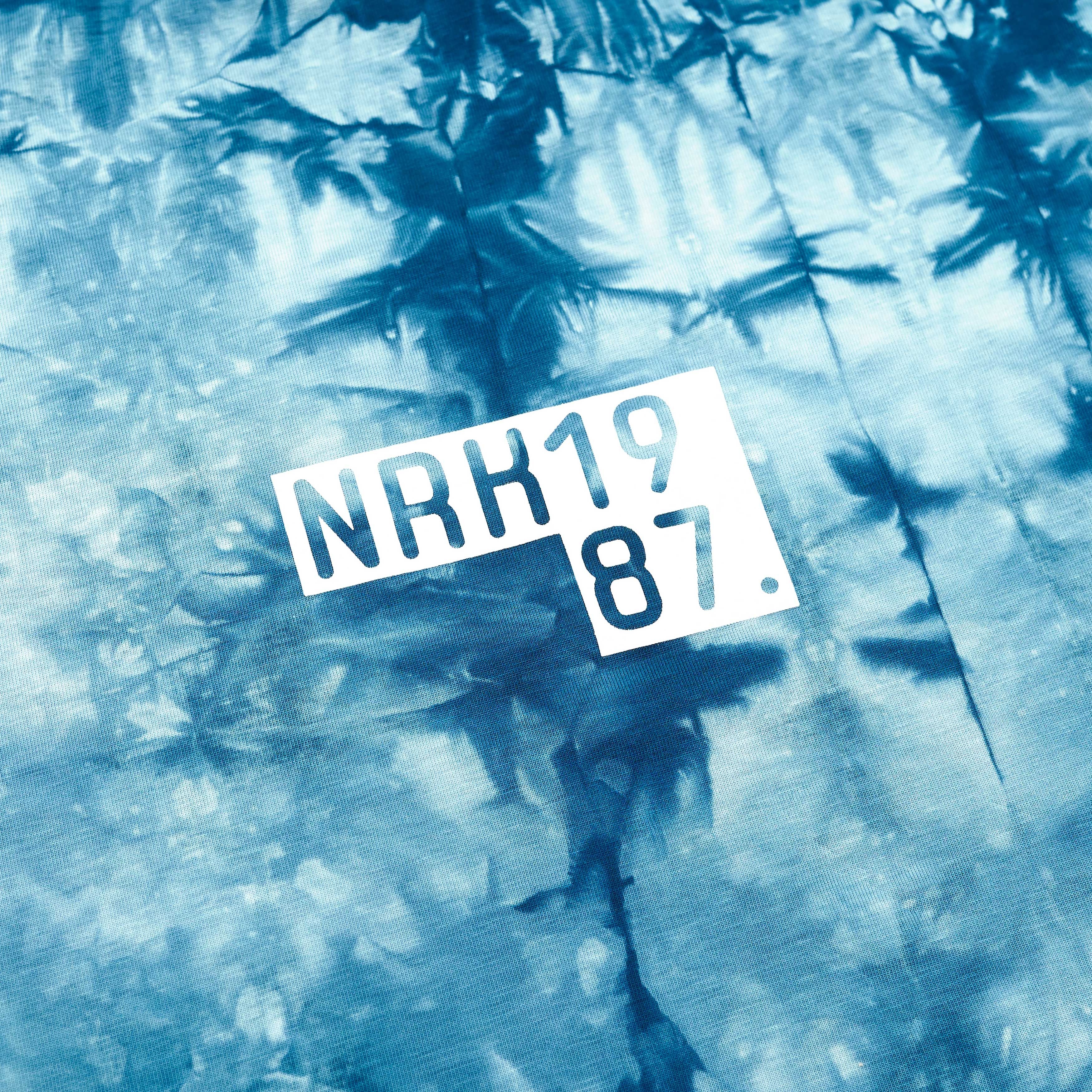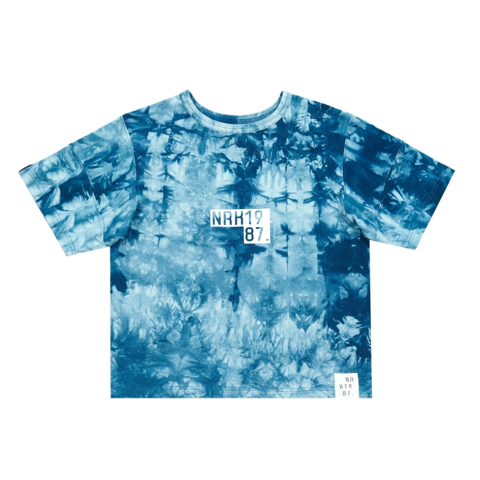 T-shirt made of thick cotton dyed in navy tai-dai blue. Loose wide silhouette with dropped shoulder seam. Wearable print with added rubber. Stitched NFC tag under logo.