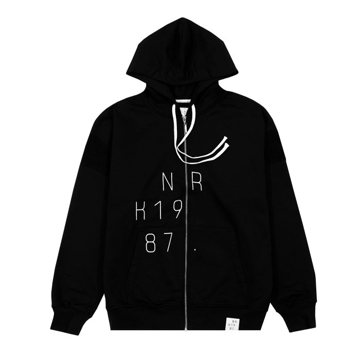 Zippered sweatshirt made of black heavy cotton. Loose wide silhouette with dropped shoulder seam. Wearable print with added rubber. Inverted fabric inserts at shoulders. Sturdy metal branded hardware. Voluminous double-lined hood. Contrasting cord. Hidden pocket with GPS device and stitched NFC tag under logo.