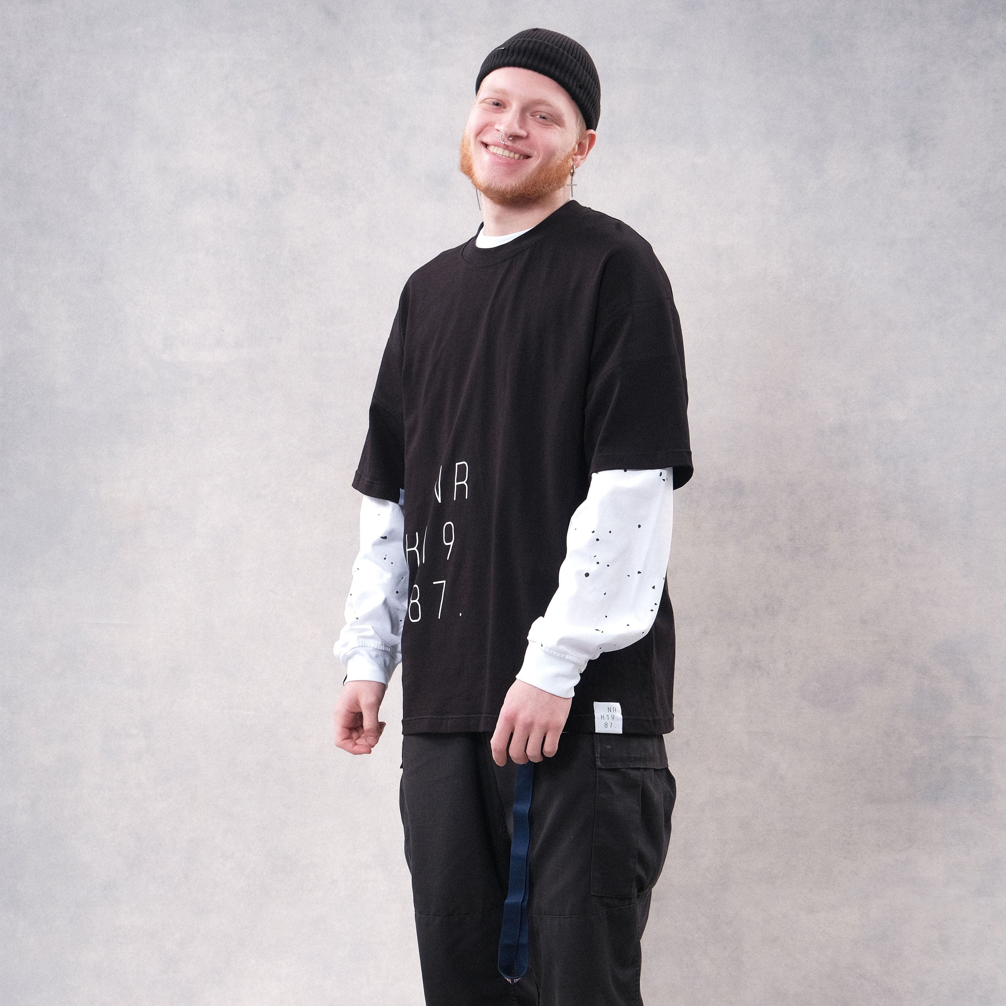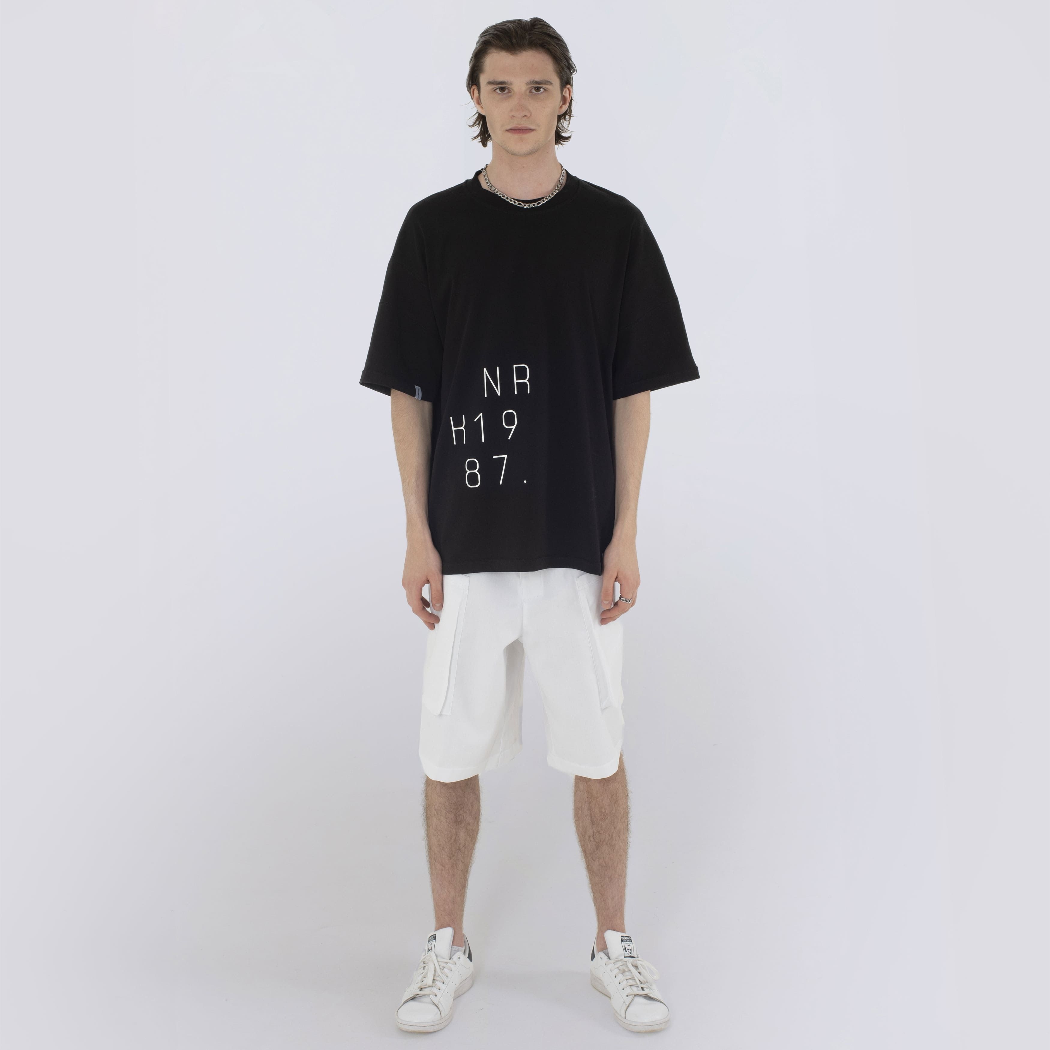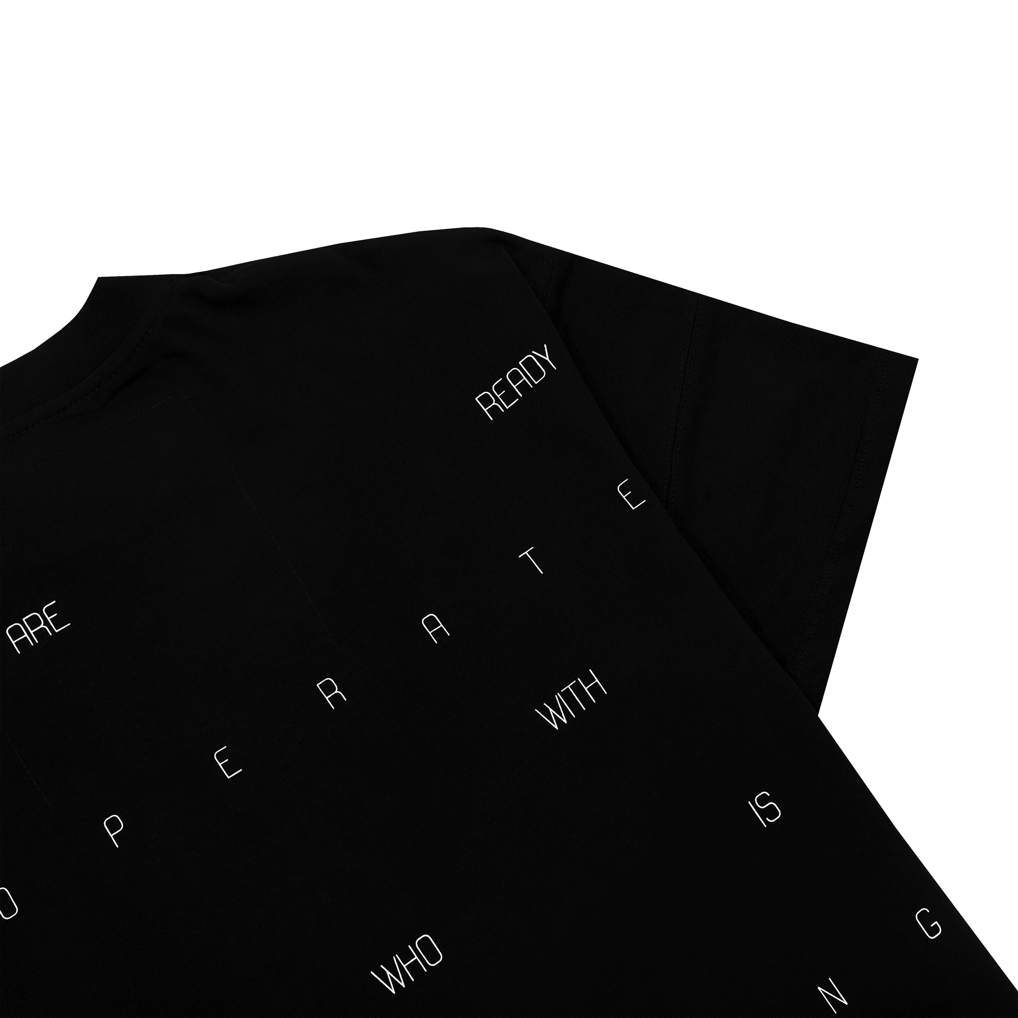 Black cotton heavy weight T-shirt. Loose wide silhouette with dropped shoulder seam. Wearable prints with added rubber. Fabric inserts at shoulders. Stitched NFC tag under logo.