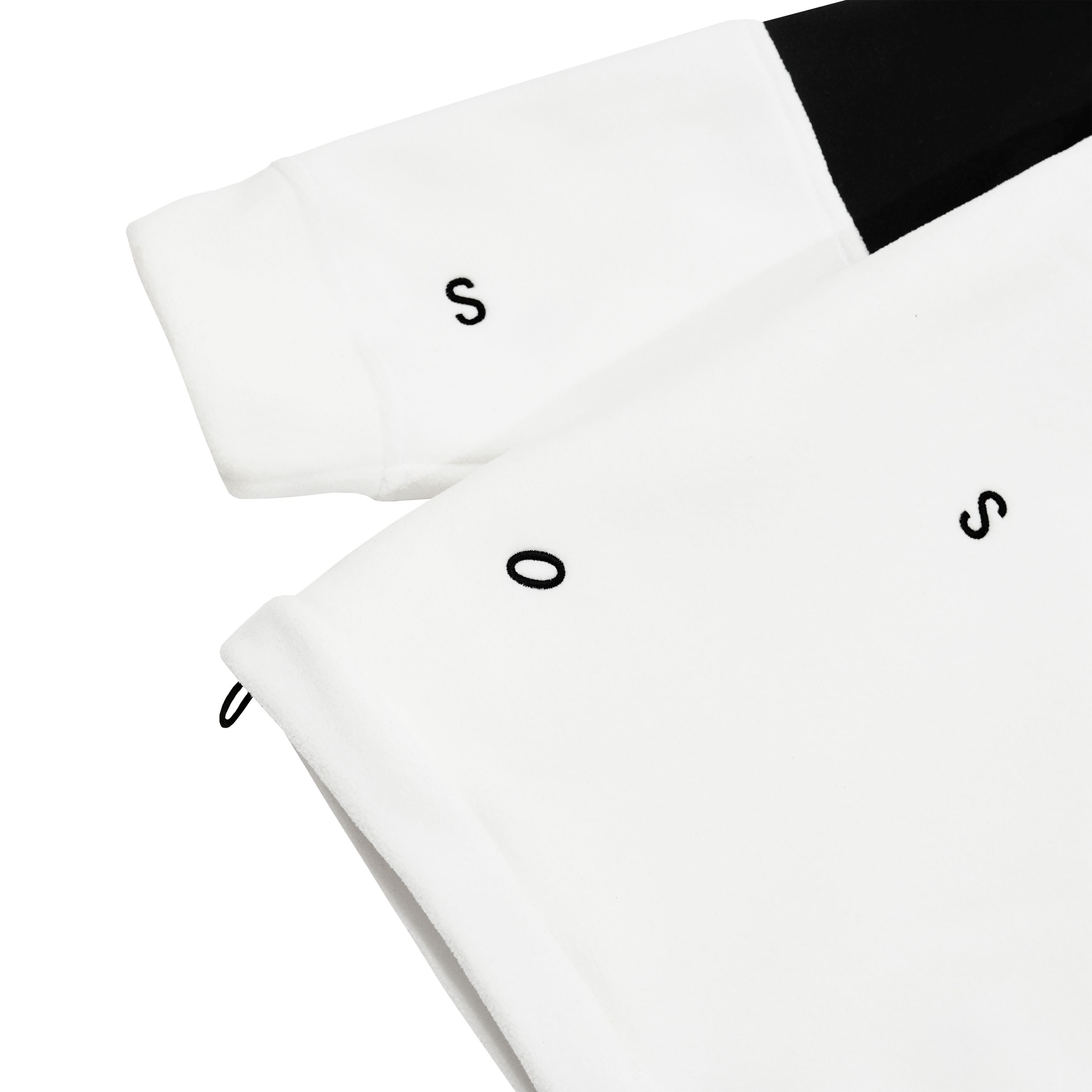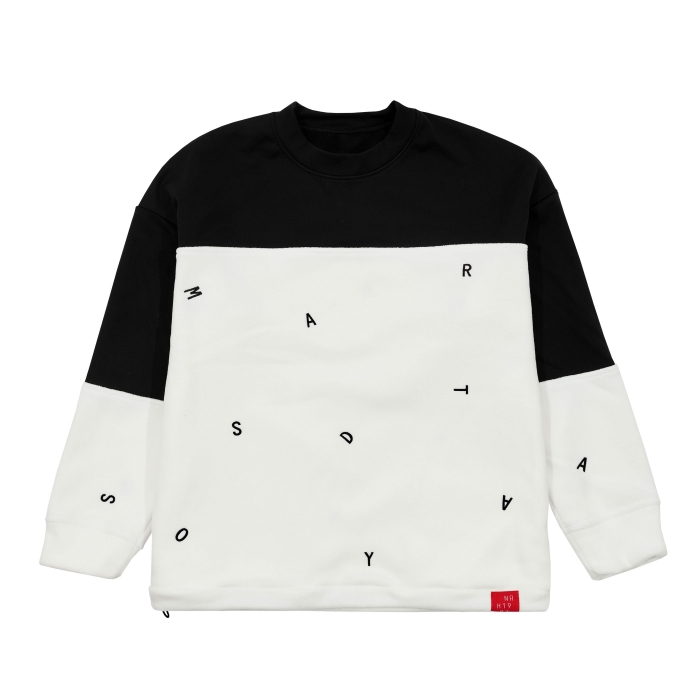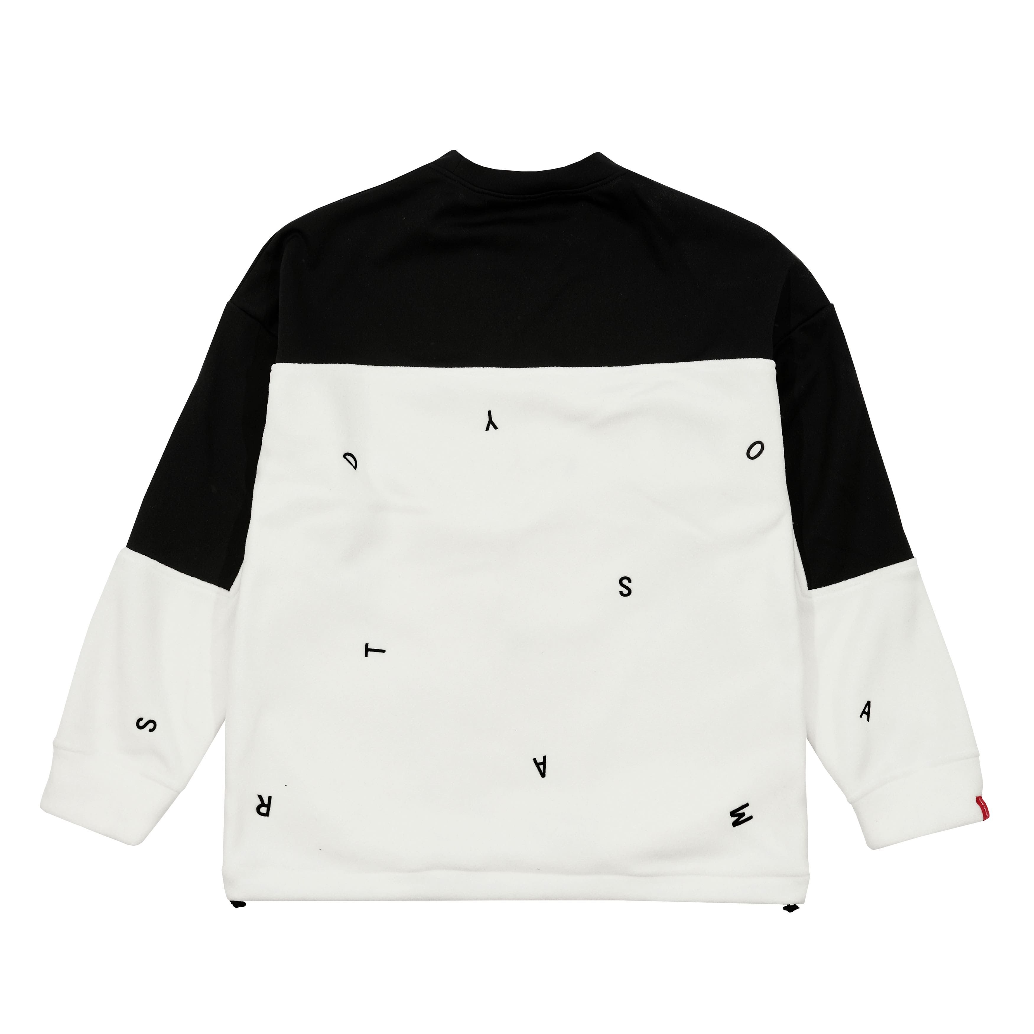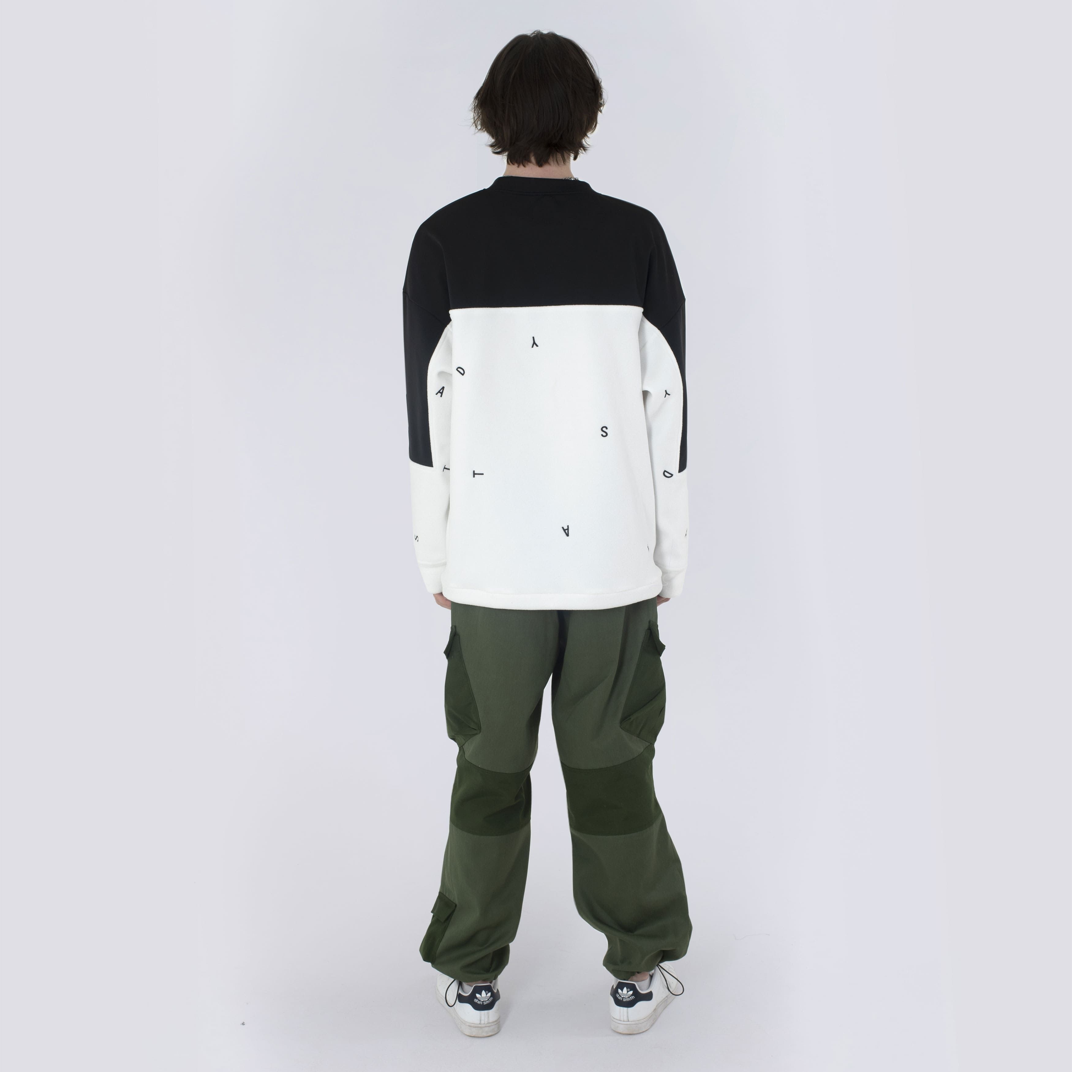 Black and white sweatshirt made of combination of two materials - top in softshell with water-repellent effect, bottom in tough soft fleece. Embroidered graphic. Concealed side zippered pockets. Elastic grip at the bottom to adjust the volume of the silhouette. Wide fit and oversize silhouette. Padded cuffs with elastic band. Hidden pocket with GPS device and stitched NFC tag under logo.
